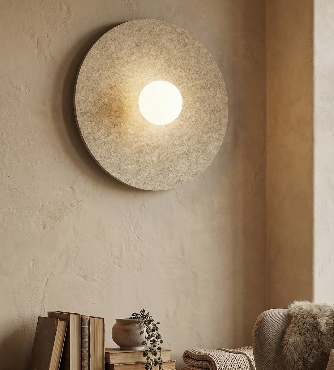 CALMA seinavalgusti toob oma pehme ja ümara naturaalsest vildist varjuga igasse ruumi orgaanilist soojust. See elegantne seinavalgusti pakub õrna ja atmosfäärilist valgustust, samas kui vildist viimistlus lisab peene tekstuuri, muutes selle ideaalseks aktsendiks rahulikesse magamistubadesse, esikutesse või Skandinaavia stiilis eluruumidesse.