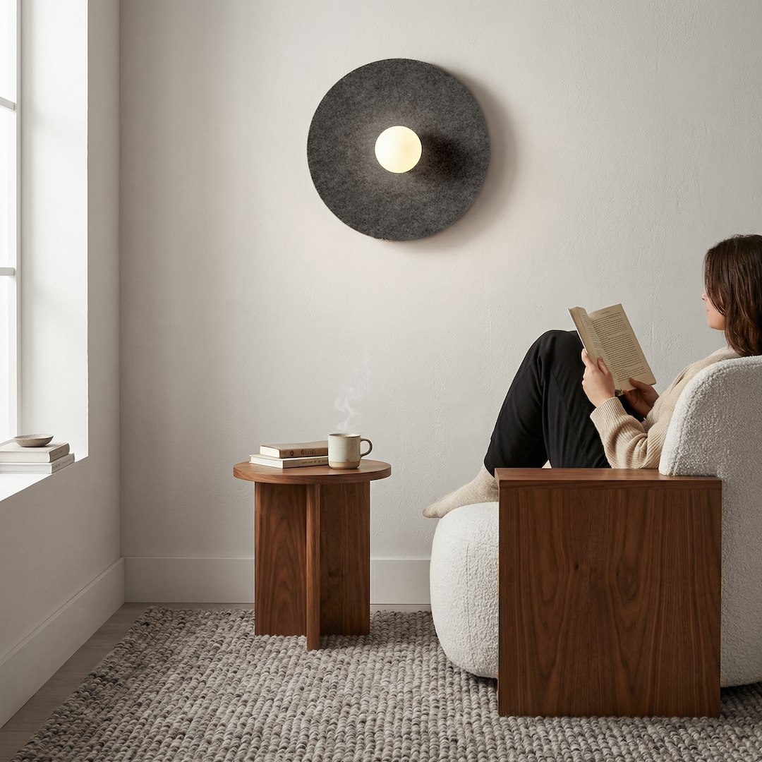CALMA seinavalgusti toob oma pehme ja ümara naturaalsest vildist varjuga igasse ruumi orgaanilist soojust. See elegantne seinavalgusti pakub õrna ja atmosfäärilist valgustust, samas kui vildist viimistlus lisab peene tekstuuri, muutes selle ideaalseks aktsendiks rahulikesse magamistubadesse, esikutesse või Skandinaavia stiilis eluruumidesse.